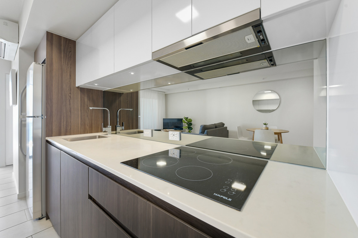 Modern kitchen with stone benchtops, quality appliances, and ample storage